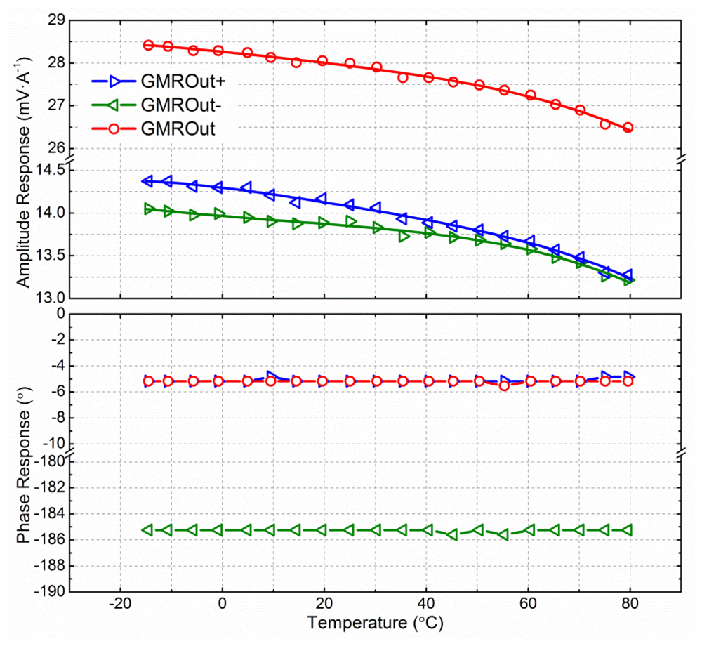 The differential output of the GMR current sensor decreased with rising temperature. The amplitude response was 28.43 mV·A−1 at −15 °C, but decreased to 26.49 mV·A−1 at 80 °C. The TMCA is 0.0751%·°C−1. In contrast, the phase response was independent of temperature, and the phase lag with respect to the input current was −5.18°, as shown in Figure 13.