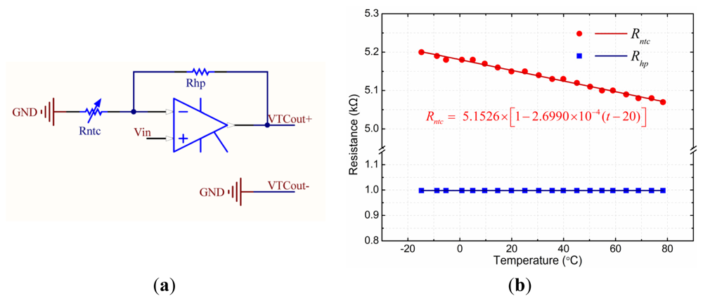 As shown in Figure 14(a), Vin is the input voltage of the thermal compensation unit. VTCout+ and VTCout- is the output of the thermal compensation unit, respectively, connected to the V+ and V− of the GMR chip (as shown in Figure 4). Rntc is a linearized NTC thermistor, and Rhp is a high precision resistor. The output of the thermal compensation unit that is connected to the power supply of the GMR chip can be described by Equation (7):