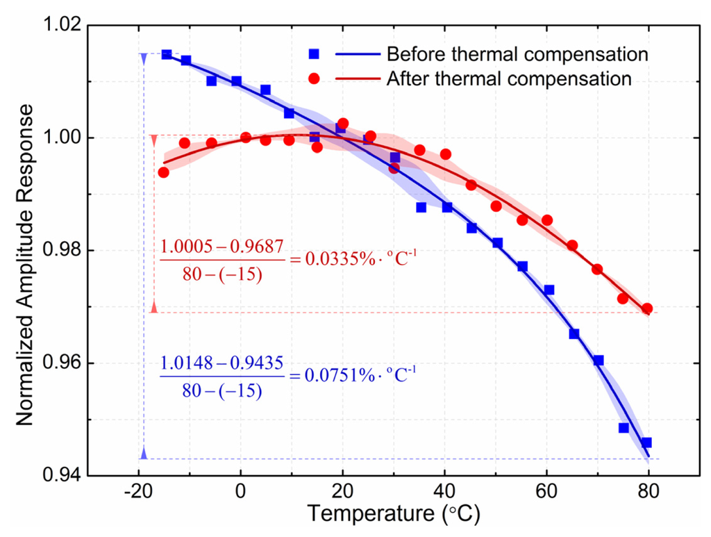 Before the thermal compensation, the amplitude response decreased monotonically with rising temperature. The maximum normalized value was 1.0148 at the temperature of −15 °C, while the minimum normalized value was 0.9435 at the temperature of 80 °C, and the TMCA is 0.0751%·°C−1 before the thermal compensation. After the thermal compensation, the amplitude response was parabolic with rising temperature. The maximum normalized value was 1.0005 at the temperature of 10 °C, while the minimum normalized value was 0.9956 and 0.9435 respectively at the temperature of −15 °C and 80 °C, and the TMCA decreased to 0.0335%·°C−1 after the thermal compensation. With this kind of simple-culture thermal compensation unit, the sensor obtained the appreciable reduction in temperature dependence.