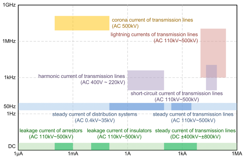 A variety of currents need to be measured in the smart grid. The coverage of the magnitude and the frequency of typical currents in the smart grid are shown in Figure 16. The magnitude of currents varies from 1 μA to 200 kA, and the frequency of currents varies from DC to 100 MHz, and the working state varies from steady-state to transient-state. Many of the currents in the figure are typical values found in the transmission lines and distributed networks. The diversity of these requirements is well matched by the versatility of GMR current sensors as described earlier.