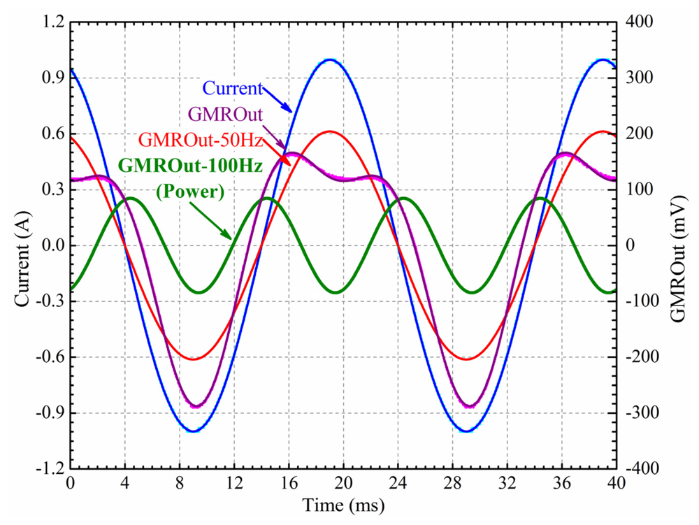 To demonstrate the capability of GMR current sensor mentioned above to measure instantaneous power, the GMR current sensor was used to measure alternating instantaneous power delivered to a 10 Ω resistor. The resistor was powered by an AC voltage source at 50 Hz and 10 V peak to peak. As shown in Figure 17, the output of the GMR current sensor contained two frequency components: 50 Hz and 100 Hz. The 100 Hz frequency component showed the alternating instantaneous power of the resistor, and the 50 Hz frequency component was caused by the asymmetry of the Wheatstone bridge.
