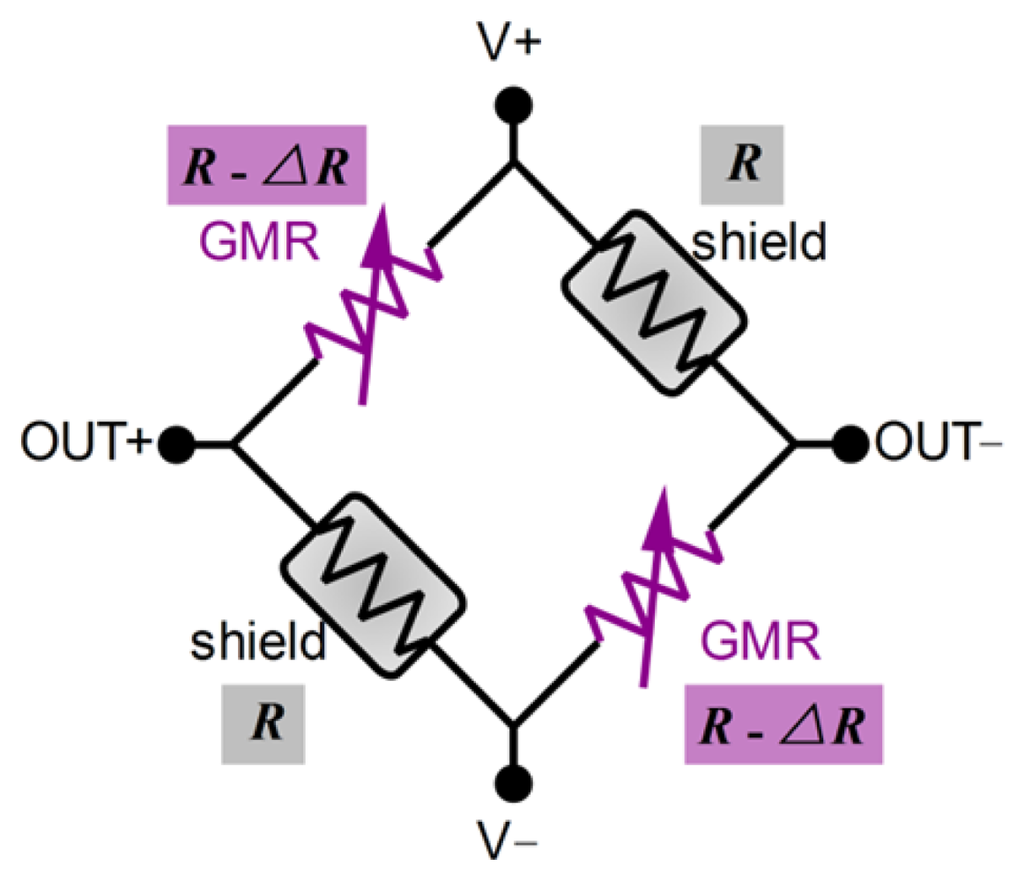 In order to convert the magnetic signal to a voltage signal that can be easily measured, a Wheatstone bridge is used in the design of the GMR chip (Figure 4). In the GMR chip, four resistive elements are arranged as follows: two are active sensing elements and two are shielded elements. Due to limitations in material processing and manufacturing technology, the four resistive elements cannot be manufactured identically, so their magnitudes are slightly different when the magnetic field is not present.