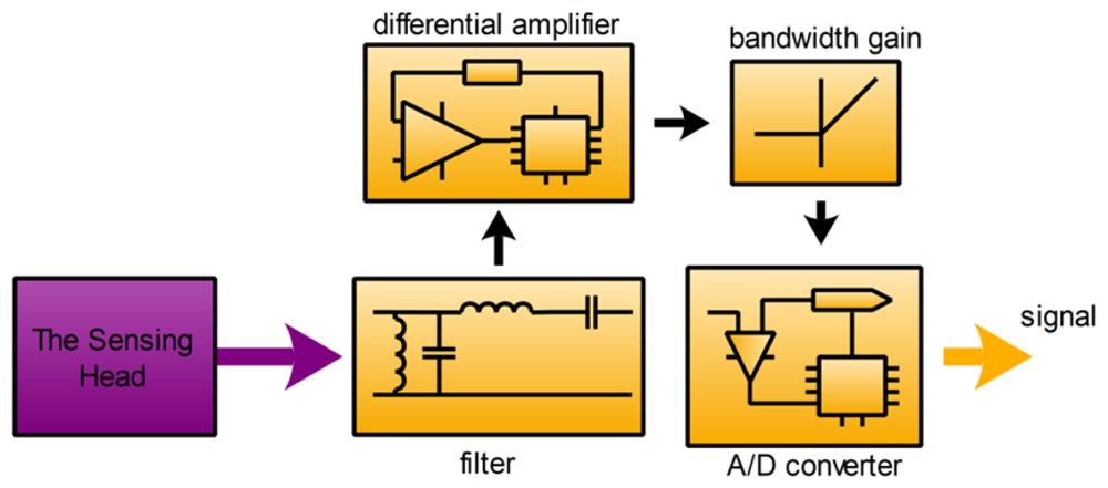 The sensor system contains three main subsystems: the sensing head, the signal processing subsystem and the power supply subsystem. Each subsystem affects the overall performance of the sensor. The block diagram of the sensor system is shown in Figure 2.