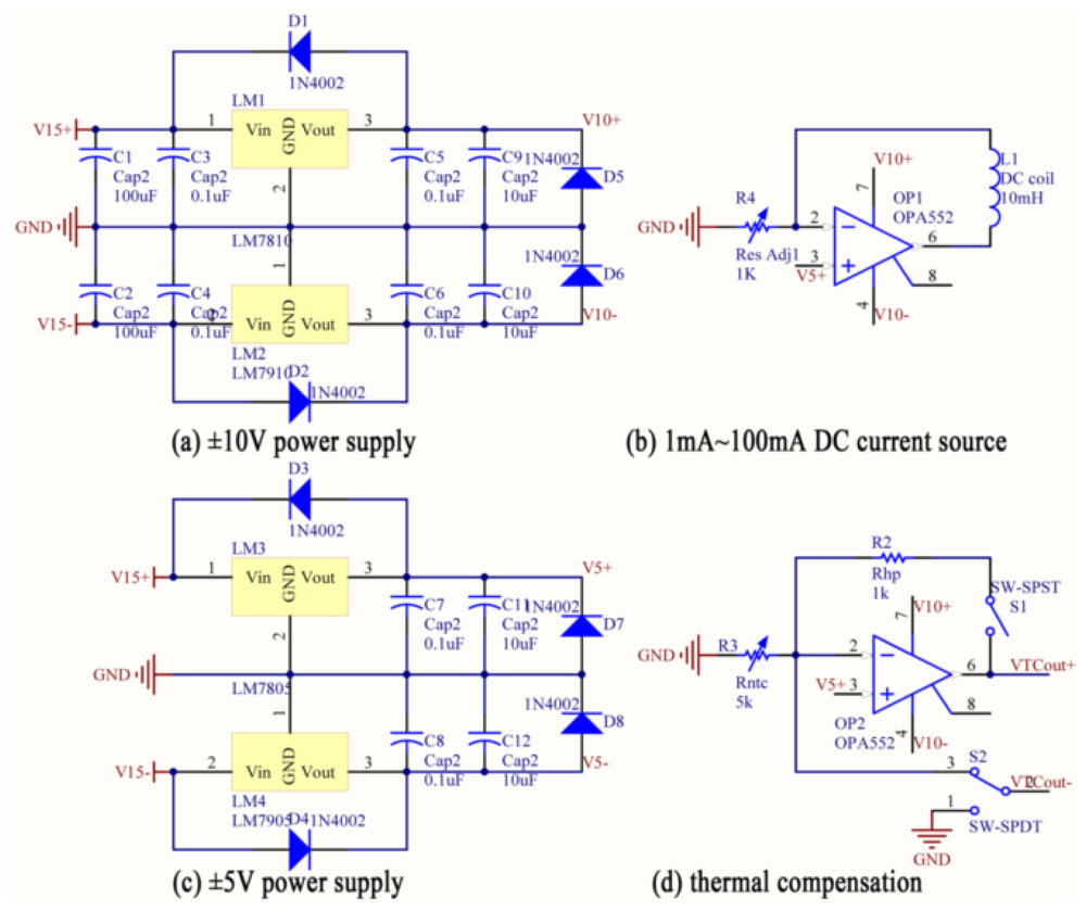 The circuit diagram of the sensor system is shown in Figure 7. It contains three parts: the power supply subsystem, the sensing head and the differential amplifier unit. The power supply subsystem provides following power sources: ±10 V power source for the operational amplifier and the differential amplifier, ±5 V power source for the GMR chip, 1 mA∼100 mA DC current source for the DC coil and 5 V reference voltage for the system.