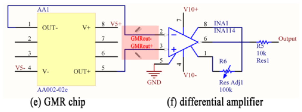 As mentioned, due to material processing and manufacturing technology limitations, it is impossible to manufacture the four resistive elements shown in Figure 4 identically. This results in voltage variations between the positive and negative outputs of the GMR current sensor when no current passes through the wire being measured. Therefore, there is a component in the output of the GMR current sensor, which the magnitude of the component is linearly related to the voltage of the load, and frequency is the same as the voltage of the load. This offset needs to be taken into account and mitigated in practice.