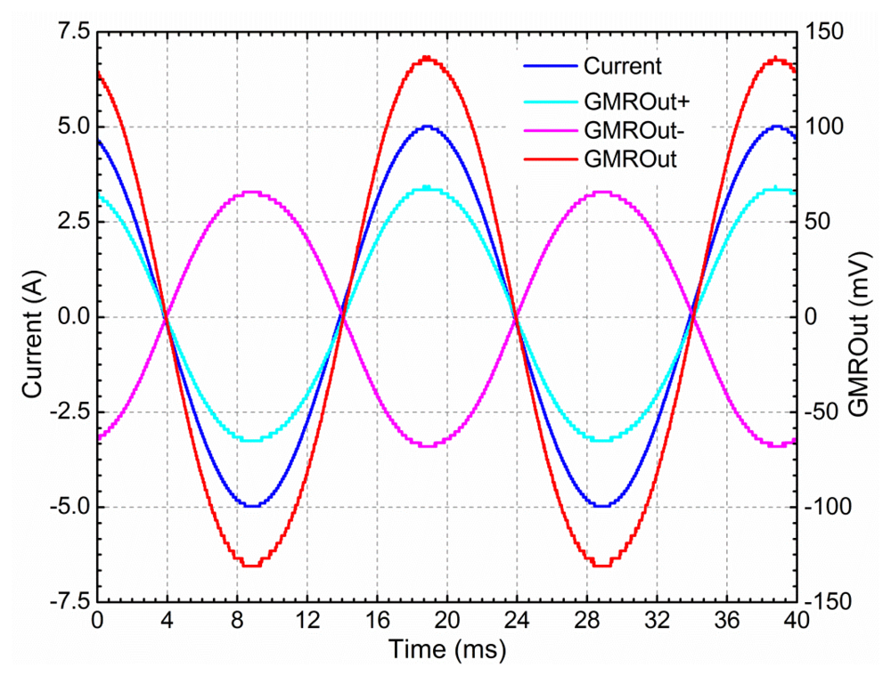 In order to get the typical performance of the GMR current sensor before being processed by the thermal compensation unit and the differential amplifier unit, the terminals of the power supply of the GMR chip was connected to the ±5 V outputs of the power supply subsystem, and the voltages were directly measured from the two outputs of the GMR chip, as shown in Figure 7.