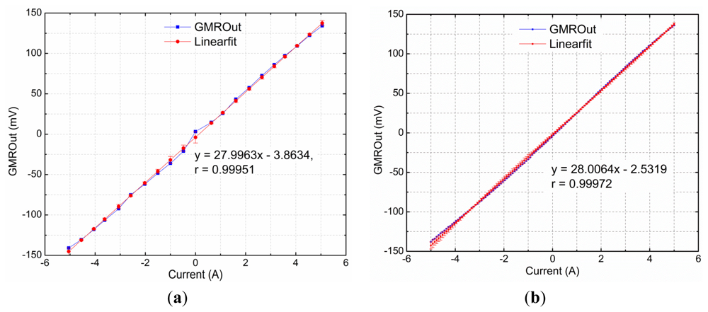 In the case of 0∼±5 A DC input range, the sensitivity of the GMR current sensor was 27.9963 mV·A−1, and the zero-current drift was 3.8634 mV, and the linearity was 0.99951. In the case of 0∼±5 A AC input range, the sensitivity of the GMR current sensor was 28.0064 mV·A−1, and the zero-current drift was 2.5319 mV. The linearity was 0.99972, which became higher as the measured current range decreased. Figure 9 also shows that the largest errors occurred when the measured currents were near −5 A. The measurement resolution of the GMR current sensor is 10 mA for the 0∼±5 A input range.