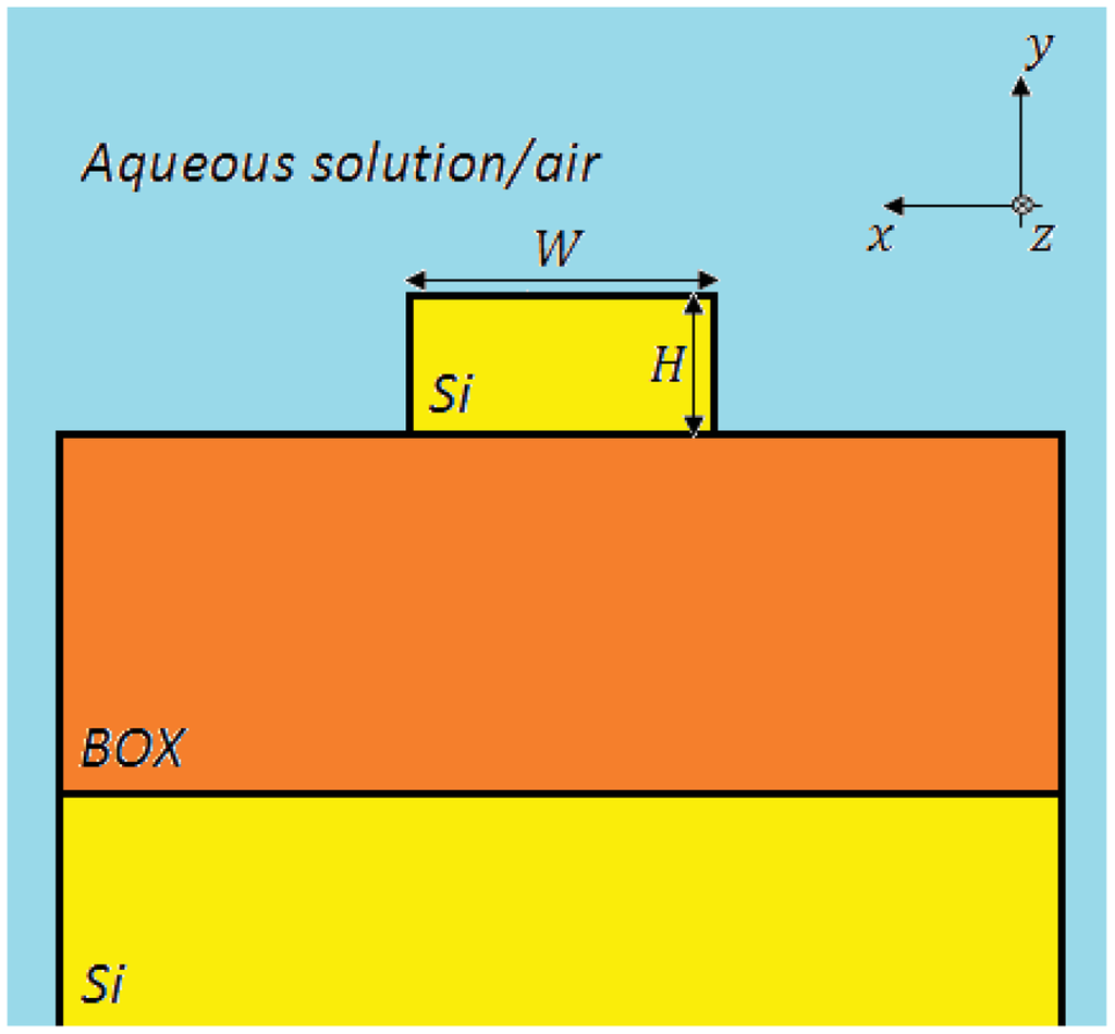 Optical waveguides realized in silicon on insulator (SOI) technology are typically composed of a top silicon layer, a few hundreds of nanometers thick, a 1–2 μm-thick buried oxide (BOX) substrate, and a bottom silicon layer (several hundreds of μm thick), which is a support for the optical chip. The main advantage consists in a large refractive index contrast (∼2 at λ = 1.55 μm), since the refractive indices of silicon and BOX are equal to nSi = 3.476 and nOx = 1.444 at λ = 1.55 μm, respectively. The cover medium (cladding) could be an aqueous solution, in which the analyte is dissolved (Figure 1), or simply air, depending on the sensing application.