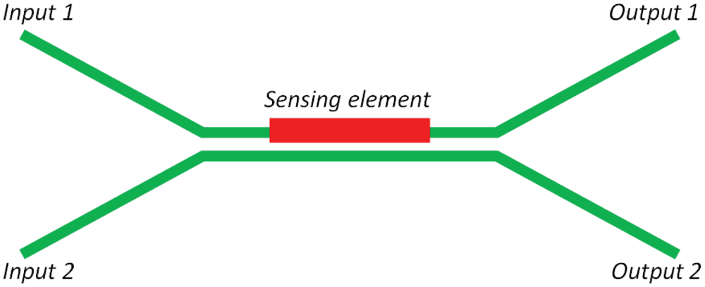 Mach-Zehnder interferometers (MZIs) have been widely proposed for chemical and biochemical sensing applications. In particular, the schematic sketched in Figure 10 represents a MZI-based architecture characterized by a sensing arm (i.e., the waveguide exposed to cover medium) and a reference arm (i.e., the waveguide covered by an insulating layer such as SU-8, Teflon, SiO2), jointed together by input and output Y-junctions. The relation between optical intensity at the sensor output and that propagating at the input section of the overall device is given as [60]:
