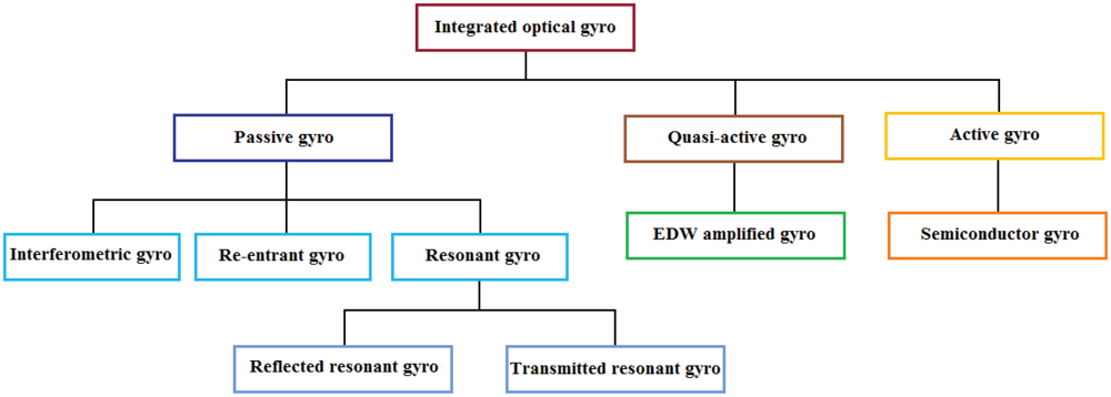 As fiber optic gyros, passive configurations can be further classified into interferometric integrated optical gyros (IIOGs), resonant integrated optical gyros and resonant-interferometric integrated optical gyros (RIIOGs) (also is called re-entrant gyro). The operating conditions of a passive resonant gyro are reflection mode (RRIOG) and transmission mode (TRIOG). The classification of IOGs is summarized in Figure 12.