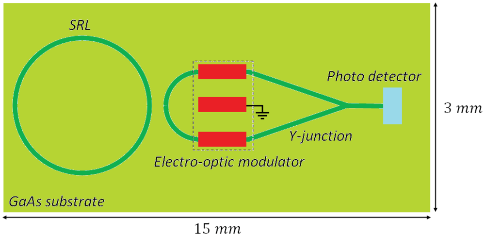 The first optical gyroscope completely realized in an OptoElectronic Integrated Circuit (OEIC) has been theoretically proposed and patented in 2001 [85]. The structure of the optical gyro (Figure 15), which can be integrated on a 15 ×3 mm2 GaAs substrate, includes an AlGaAs-GaAs (DQW) circular SRL with a radius of 1.5 mm, a circular directional coupler, an electro-optic phase modulator, a Y-junction and a photo detector.
