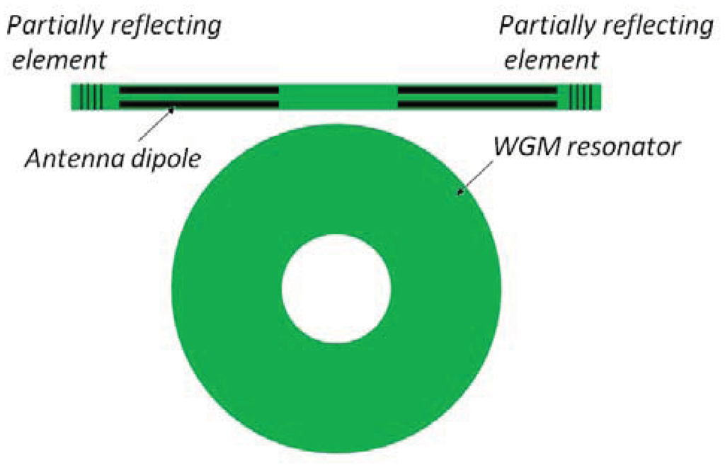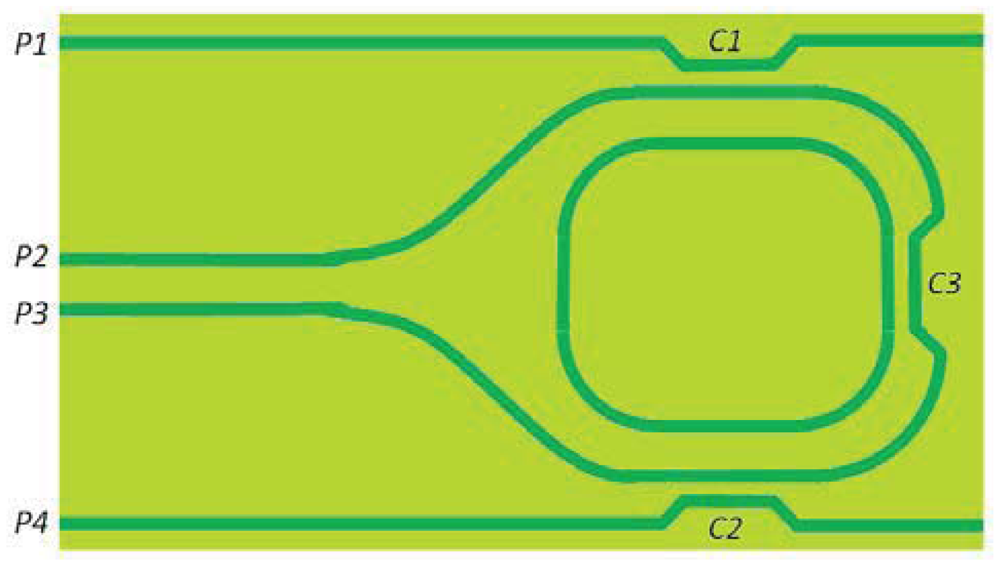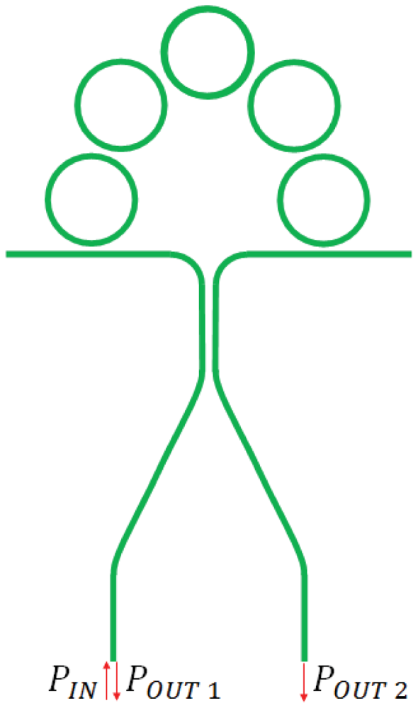 Integrated photonic sensors designed for electrical field detection are generally constituted by interferometer architectures, but planar resonant microcavities can be also used. Their sensitivity can be significantly enhanced if the spectral response of the ring resonator presents asymmetric resonances instead of the symmetric typical Lorentzian line-shape of a single cavity [35]. To this purpose, the shape of the resonant spectrum in the transition between 0% and 100% of reflectivity, can be steeper by realizing a Fano resonance with two coupled cavities [36]. In particular, it is possible to obtain an asymmetric transition with a narrower linewidth than that exhibited by a single cavity. Figure 4 shows an optical ring resonator coupled to a straight bus waveguide. In addition, Figure 5 represents a ring resonator coupled to a Fabry-Perot cavity realized on the bus waveguide by inserting two partially reflecting elements, one at the input and the other at the output.