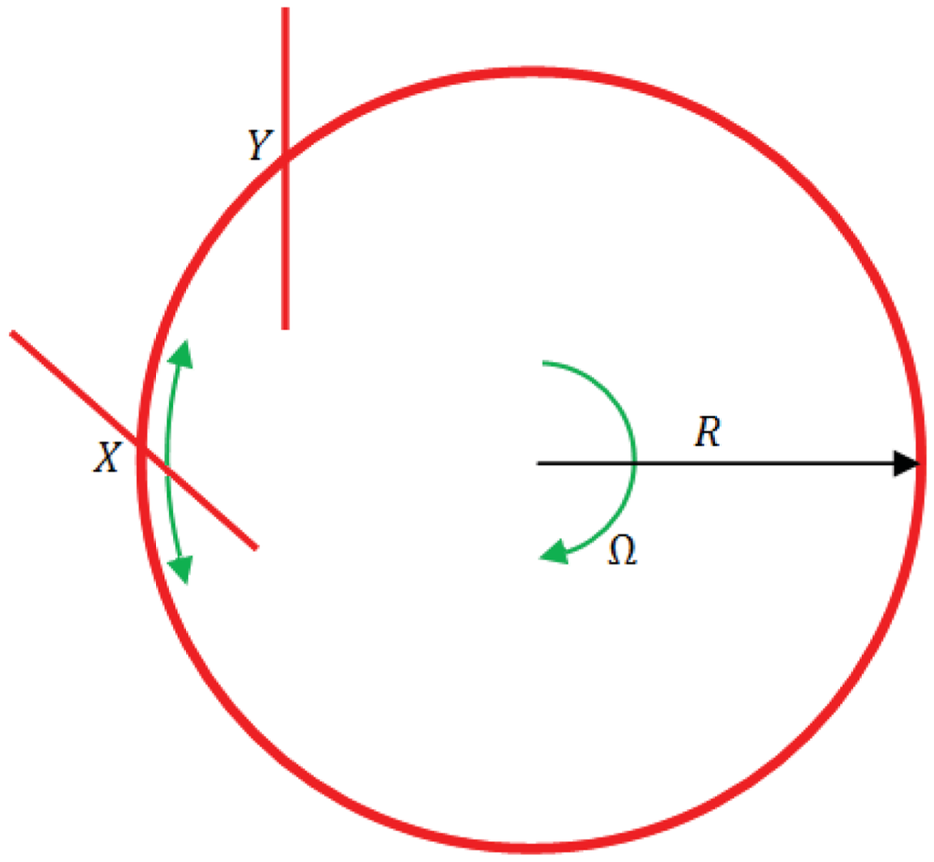 Figure 2 shows that the beam splitter will move to position Y, so that light travelling in a clockwise direction will take a higher path with respect to the condition in which the ring is not rotating. The situation is opposite for the counter-clockwise beam. In general, it is possible to state that light travelling with the direction of rotation must travel further with respect to the case in which the interferometer is stationary, while light travelling against the direction of rotation will have its path length reduced if compared with the stationary condition. Hence, the single pass transit time for the two beams is given by: