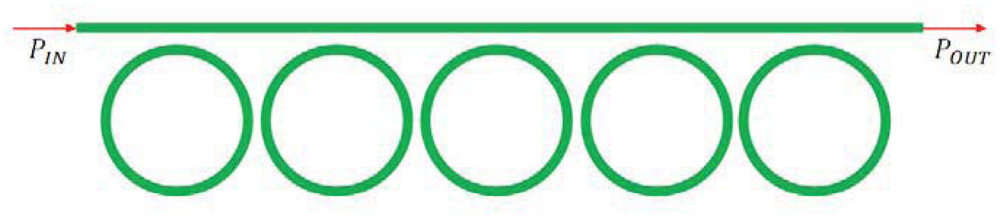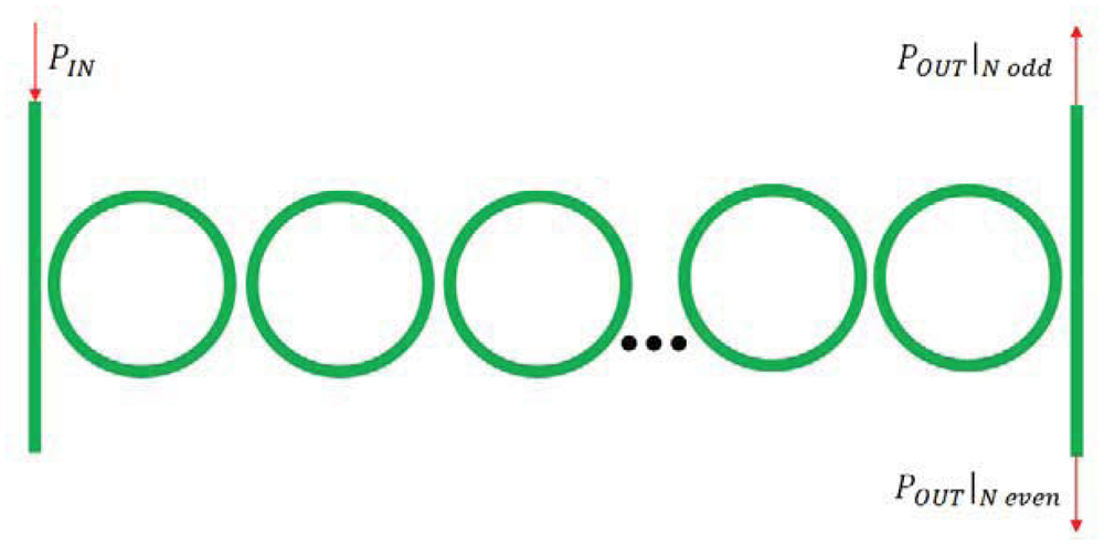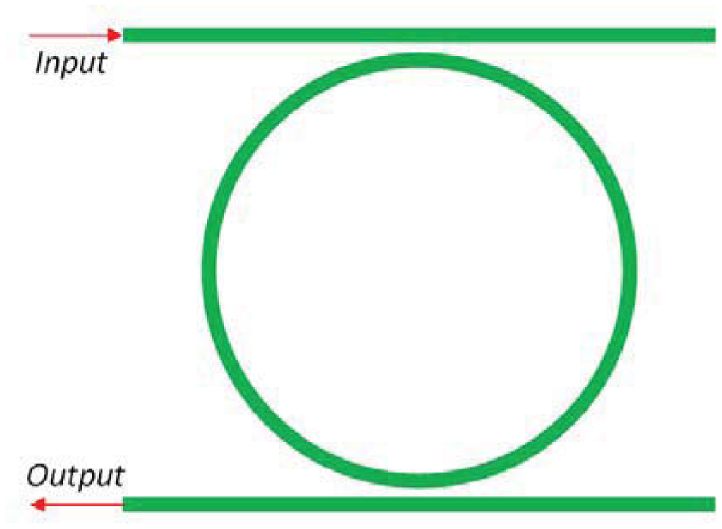 The transfer function of a single ring resonator with two bus waveguides (Figure 8) can be studied with the method based on Mason's rule and delay line signal processing [47]. This method is suitable for modeling complex structures characterized by multiple ring resonators.