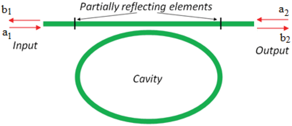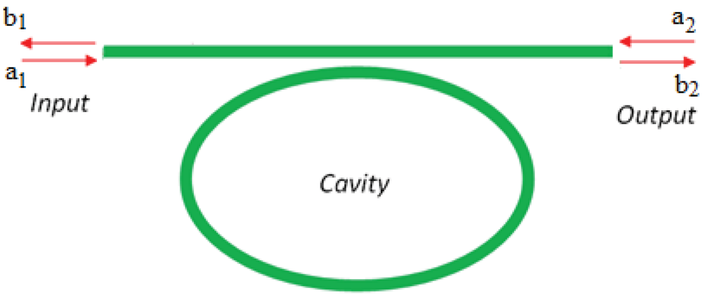 The transfer matrix of the single-mode cavity coupled to a straight bus waveguide (Figure 4) can be written as follows [37, 38]: