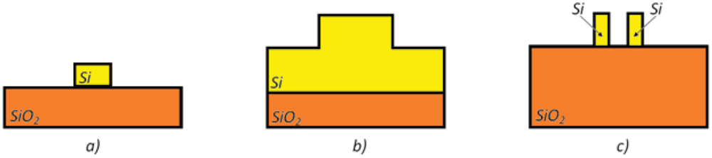 Since the optical waveguide acts as a transducer in intrinsic photonic sensors, their design is crucial and strategic for ensuring high sensing performance. In case of the SOI technological platform, different types of optical waveguides have been designed for the fabrication of integrated photonic chemical sensors (see Figure 7). For rib structures, the strong confinement of the optical field in the high refractive index core results in a low light-analyte interaction in the cover medium, so that optical properties of the exposed waveguide are not strongly influenced by the concentration of chemical species to be detected. Light-analyte interaction can be improved by using wire waveguides. In fact, a wider sensor surface can be exposed to the cover medium and both interfaces between the high and low refractive index regions (i.e., the top and bottom ones) experience a relevant optical transverse magnetic field.
