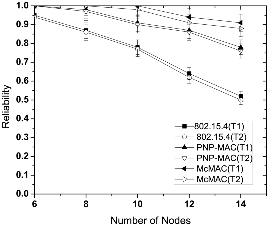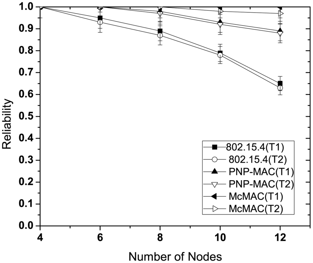 Figure 9 illustrates the reliability for different number of nodes without emergency traffic. With the increasing number of nodes, the reliability decreases sharply for each traffic case of 802.15.4 due to increased collisions as the traffic load increases. Because of the higher priority assigned to both of these traffic types, PNP-MAC exhibits a much better reliability performance than 802.15.4. In contrast, we observe almost 100% reliability for both type 1 and type 2 traffic in McMAC due to the allocation of diversified periods for request packet transmission (which reduces contention to a greater extent), along with contention-free slot allocation.