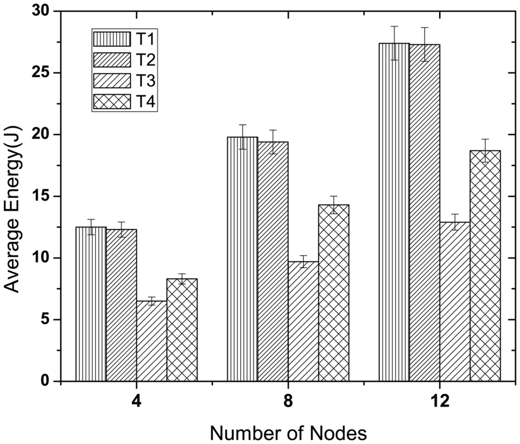 Figure 12 illustrates the energy consumption of all the periodic traffic types in McMAC. Here, we consider three network sizes (4, 8 and 12) with an equal number of traffic types in each case. As the figure shows, the type 1 and type 2 traffic consume almost similar amounts of energy for different network sizes, and their energy consumption is higher than that of type 3 and type 4. This is because two distinct periods (CAPreq and CFPdata) are required for guaranteed transmission for these reliability-constrained traffic (type 1 and type 2), whereas a single period (PCAPdata) is needed for type 3 and type 4 traffic. However, type 3 traffic has to perform less backoff than type 4 because of its higher priority, which results in less overhearing and idle listening and hence lower energy consumption.