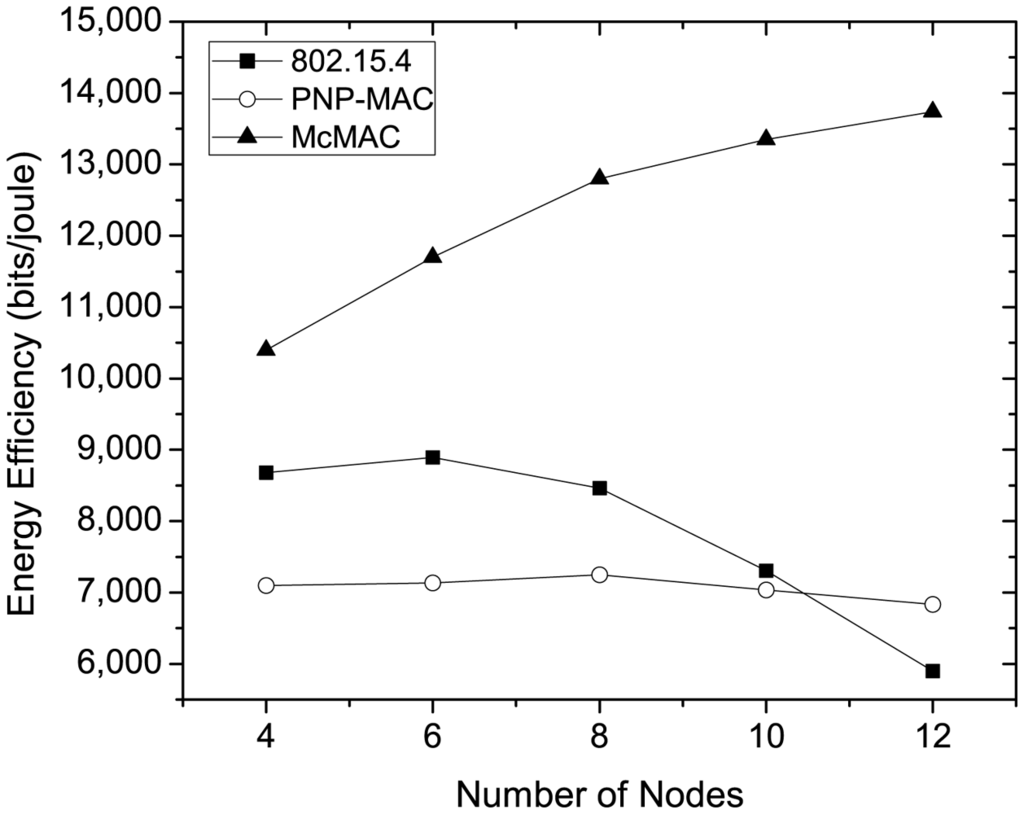 Figure 13 shows the energy-efficiency for different protocols at varying traffic loads as the number of nodes increases. As the figure illustrates, PNP-MAC exhibits a lower energy-efficiency, and the efficiency decreases slightly as the traffic load increases. Although 802.15.4 has better energy-efficiency than PNP-MAC during low traffic loads, a sharp decrease is observed when the traffic load reaches a certain level (N = 8), and the energy-efficiency has the lowest value when N = 12. This is because the network throughput decreases dramatically for 802.15.4 at higher traffic loads, although it has better energy consumption than PNP-MAC. In contrast, McMAC shows the highest energy-efficiency for different traffic loads, as it has the lowest energy consumption and higher throughput, due to the diverse period allocation for diverse traffic types.