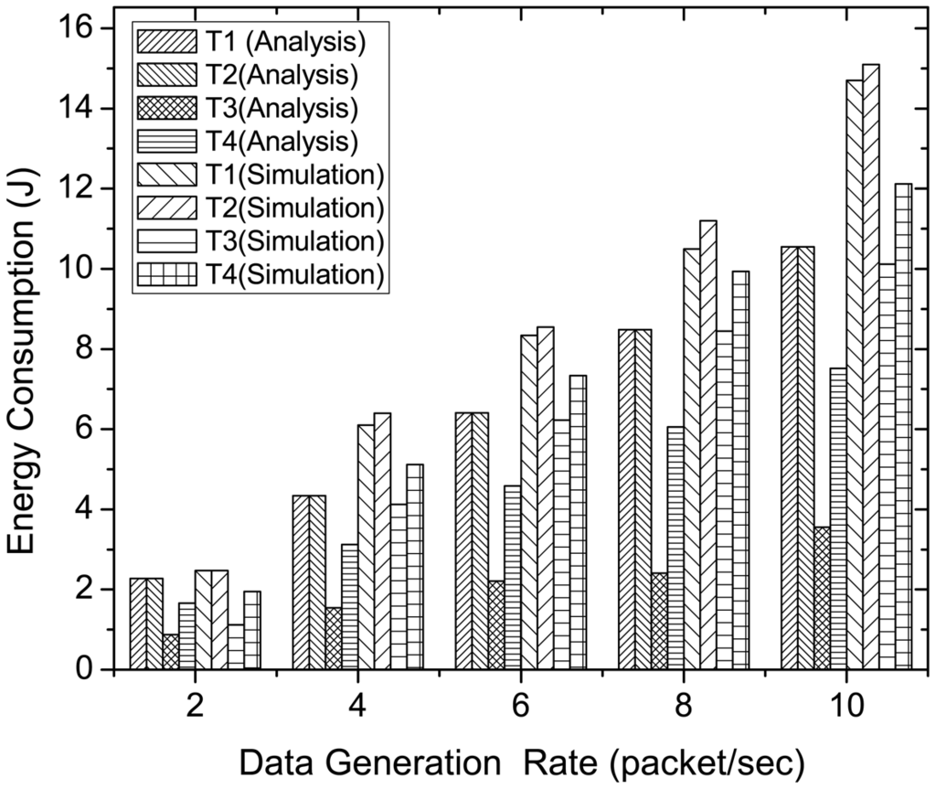 Figure 14 compares the analytical and simulation results of energy consumption for diverse traffic in McMAC, varying traffic load in terms of data generation rate. Here, we consider N = 8 and the traffic distribution follows as shown in Table 4. As the figure shows, during low traffic rate (2 packets per second), both analytical and simulation results show similar energy consumption for all traffic types. In contrast, as the data generation rate increases, we observe higher energy consumption for the diverse traffic in the simulation results than that of analysis. This is because the energy model assumes an ideal environment with no packet loss. However, the energy expenditure due to retransmission is well reflected in simulation results at higher traffic rate. Besides, the simulation results validate the analysis results in terms of the ratio of the energy consumption for diverse traffic types.