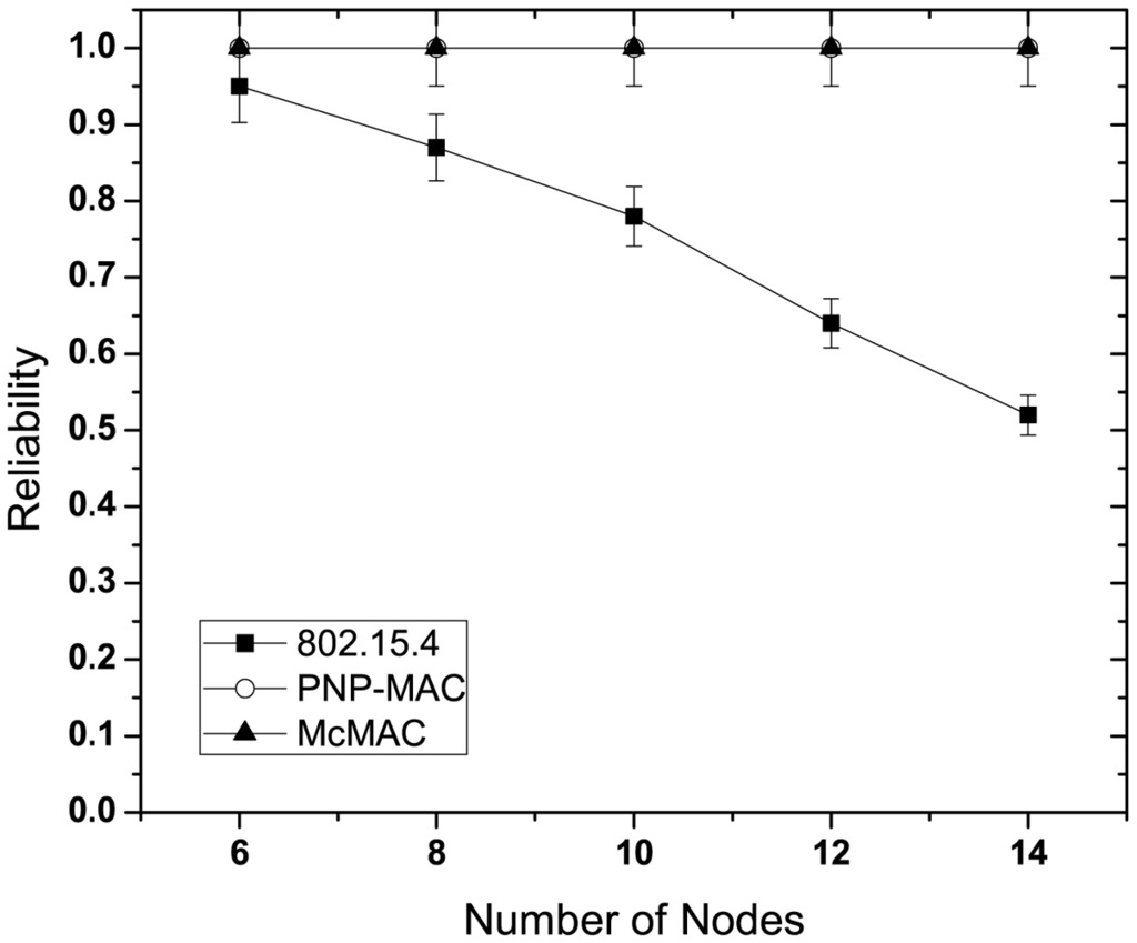 Figure 16 illustrates the reliability of the emergency packet for different network sizes. Because of their respective emergency handling mechanisms, both PNP-MAC and McMAC achieve 100% reliability, whereas 802.15.4 shows a similar reliability performance to that of the non-emergency packet for different numbers of nodes.