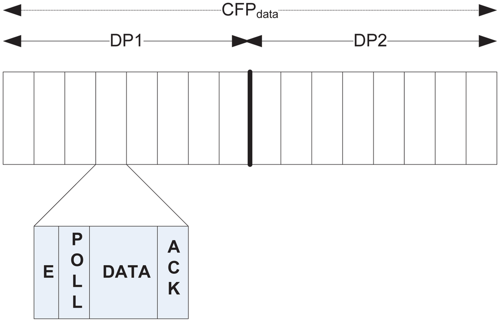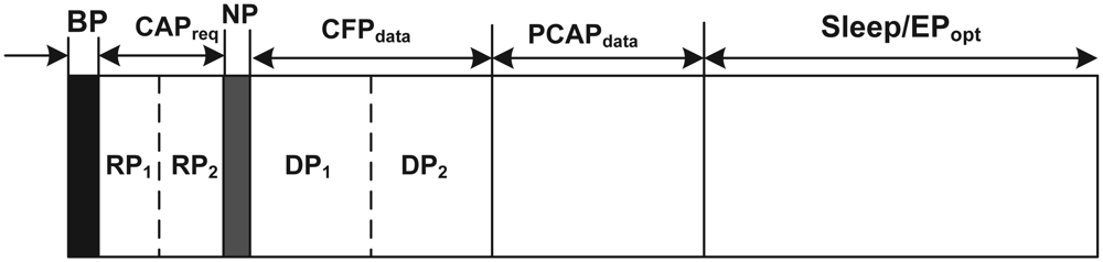The period followed by NP is CFPdata, where nodes having traffic with loss-intolerant properties (i.e., type 1 and type 2 traffic) are allowed to transmit data in a reliable manner, because the nodes are given a contention-free slot, allocated by the BC, during NP. This period is further divided into two distinct periods: DP1 and DP2 for type 1 and type 2 traffic, respectively. However, the lengths of DP1 and DP2 are set dynamically based on the requests during CAPreq. Due to the delay-sensitive nature of the type 1 traffic, the requests for those nodes are served first, and then the slots for the type 2 traffic are allocated.