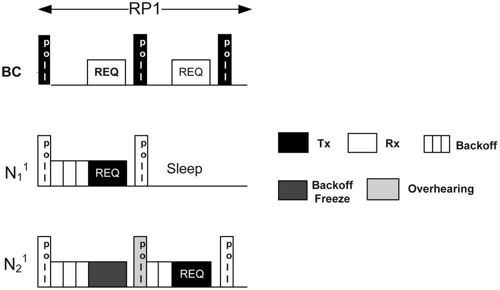 There are several reasons for using the polling-based medium access mechanism rather than the usual slotted CSMA/CA. First, this period is used for transmitting only short request packets that are periodic in nature and requires higher reliability. All transmissions from the corresponding nodes are synchronized by the poll packet reception. Due to the guided transmission by the BC using poll packets, the chances for packet collision are reduced, which increases the reliable reception of the request packets (packet collision occurs only if two nodes choose the same random backoff). Second, in this mechanism, randomized backoff is sufficient to avoid collisions from multiple transmitters; in addition, it does not need long CCA periods, which ensures better channel utilization. Finally, the backoff-freezing mechanism also reduces the unnecessary backoff counting that can occur when a new back-off procedure is started after every “channel busy” sensing.