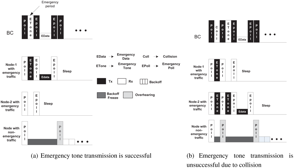 There may exist multiple nodes with type 0 traffic waiting to broadcast an emergency tone in the same period. Hence, to address the contention, a node broadcasts the emergency tone with some probability p in that period. Two cases might happen in this scenario. First, if the transmission of the tone is successful (Figure 5(a)), the BC transmits a poll packet with emergency bit = 1 (which we refer to as an emergency-poll packet), along with the ID of the winning node in the subsequent period of the emergency period, which is followed by the transmission of emergency data by the winning node. The BC then acknowledges the reception of the emergency data with another emergency-poll packet with an ack bit set. The losing nodes with type 0 traffic readily go into sleep state after overhearing the ID in the emergency-poll packet. Second, if the transmission of the tone is unsuccessful (collision occurs with other tones) (Figure 5(b)), the BC transmits a regular poll packet (emergency bit = 0), and the losing nodes may attempt transmitting their tone again in this emergency period; if the nodes are successful, the data are transmitted following the same procedure described earlier.