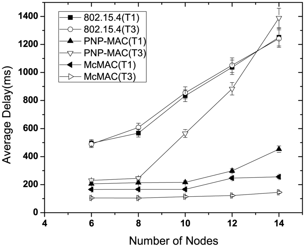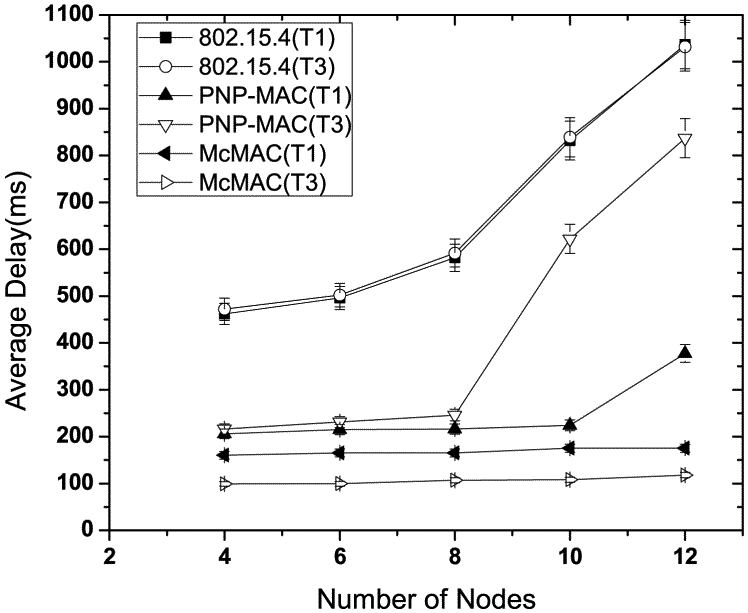 As depicted in Figure 7, in the presence of emergency traffic, the average latency increases almost linearly as the number of nodes increases for each traffic case of 802.15.4. Because the type 3 traffic has the lowest priority, the emergency traffic causes the worst delay for the type 3 traffic in PNP-MAC when the network size exceeds the CAP limit, which inhibits gaining channel access during the CAP. In contrast, because the type 1 traffic has higher priority, it is not affected as significantly by the emergency traffic. The average delay of type 1 traffic increases slightly with emergency traffic in McMAC as it shares the same slot (either during CAPreq or CFPdata) if the emergency traffic generation coincides with the type 1 traffic. However, emergency traffic has a negligible effect on type 3 traffic in McMAC as it exploits only PCAPdata for its transmission.