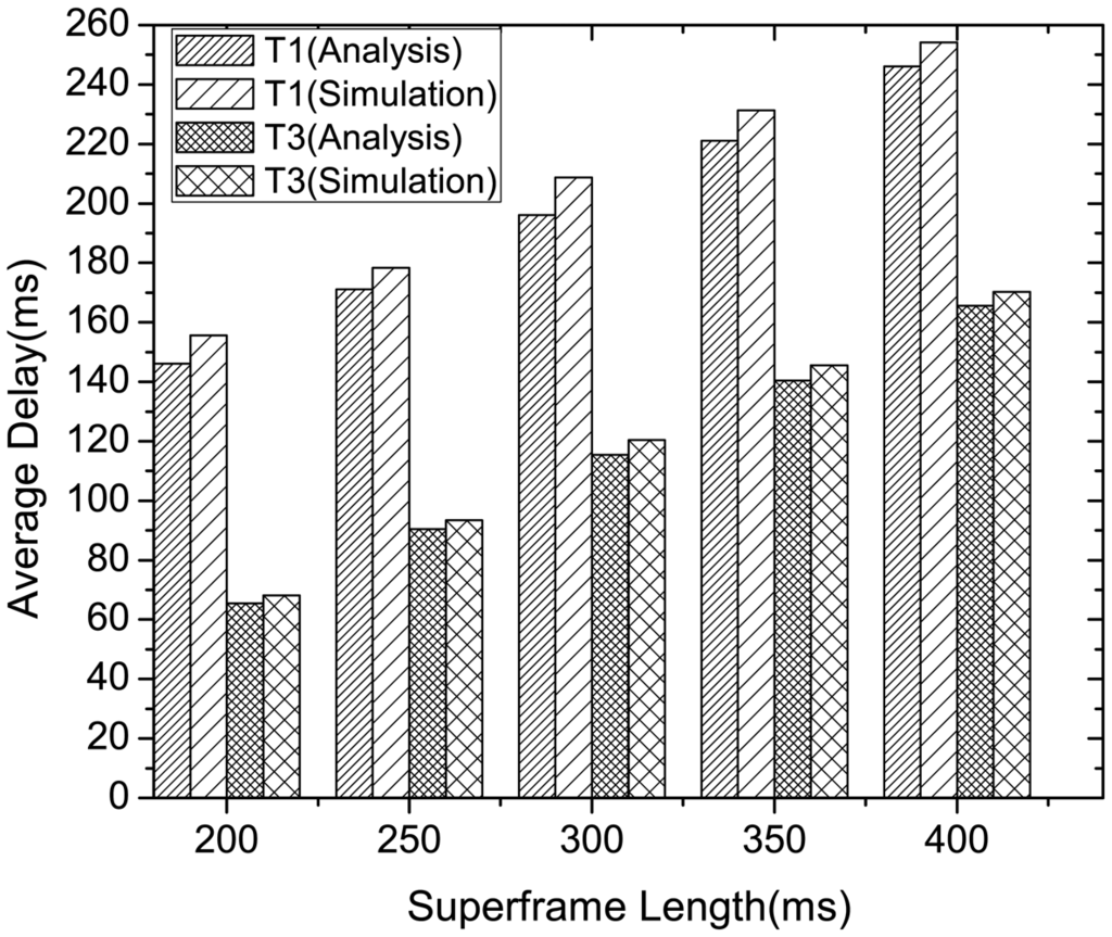 Figure 8 compares the analysis and simulation results of the latency performance of delay-constrained (type 1 and type 3) traffic in McMAC, varying the superframe length. The analytical results are evaluated using the values shown in Tables 1 and 3. Here, we consider N = 8 with two nodes from each traffic type, and each node generates four packets per second. As the figure illustrates, the latency performance in different superframe length are similar in both analysis and simulation results, where the average case delay increases with the increase in superframe length for both the traffic types. This signifies that an appropriate superframe length might be determined based on the application delay requirements for delay constrained traffic. Moreover, the type 3 traffic exhibits much lower latency than type 1 traffic as validated in both analysis and simulation. This is because the transmission of type 1 traffic requires waiting for an additional request period and notification period for contention-free transmission. Hence, in contrast to the case of type 3 traffic, the type 1 traffic can achieve higher reliability by compromising some latency.