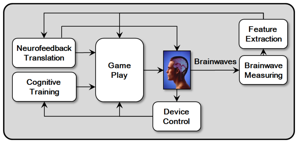 Research into neurofeedback has already been utilized in various fields, where its effects have been verified. Our goal is to enhance the traditional neurofeedback effects. Therefore, we propose a model that also applies cognitive training [13,14] to BCI serious games with neurofeedback [15,16] to improve the effects of brain functions, as shown in Figure 1. When users play a BCI serious game, they can improve their brains by not only utilizing neurofeedback but also applying cognitive training simultaneously. We call this model Hybrid Neurofeedback Model (HNM).