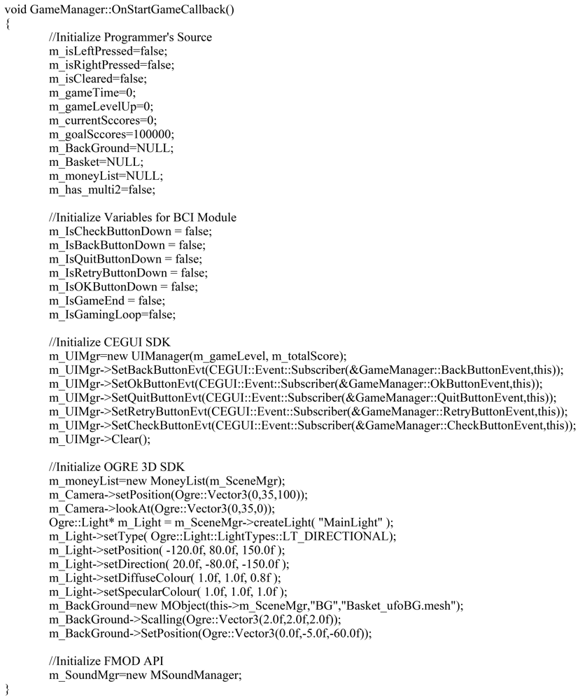 The game is completed by implementing the Callback functions defined in Table 6. For example, OnStartGameCallback is implemented as shown in Figure 11. The game is also built using C++, and the function OnStartStartCallback is defined as a member function of the class GameManager. The function OnInitBCI is called, and the game engine is initialized. As described above, the programmer only implements Callback functions that will automatically be called from BCI modules. Figure 12 shows the BCI serious game developed by our approach.