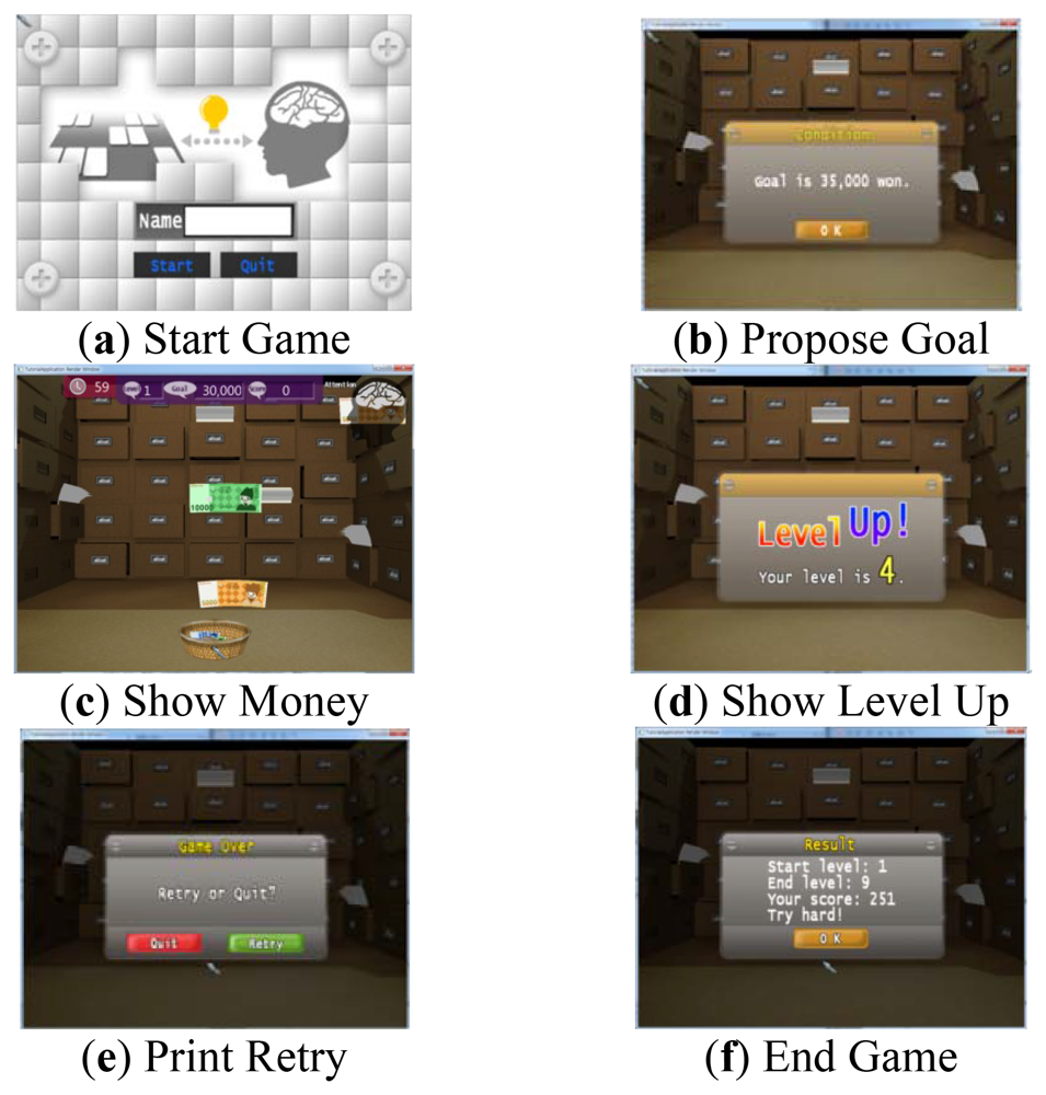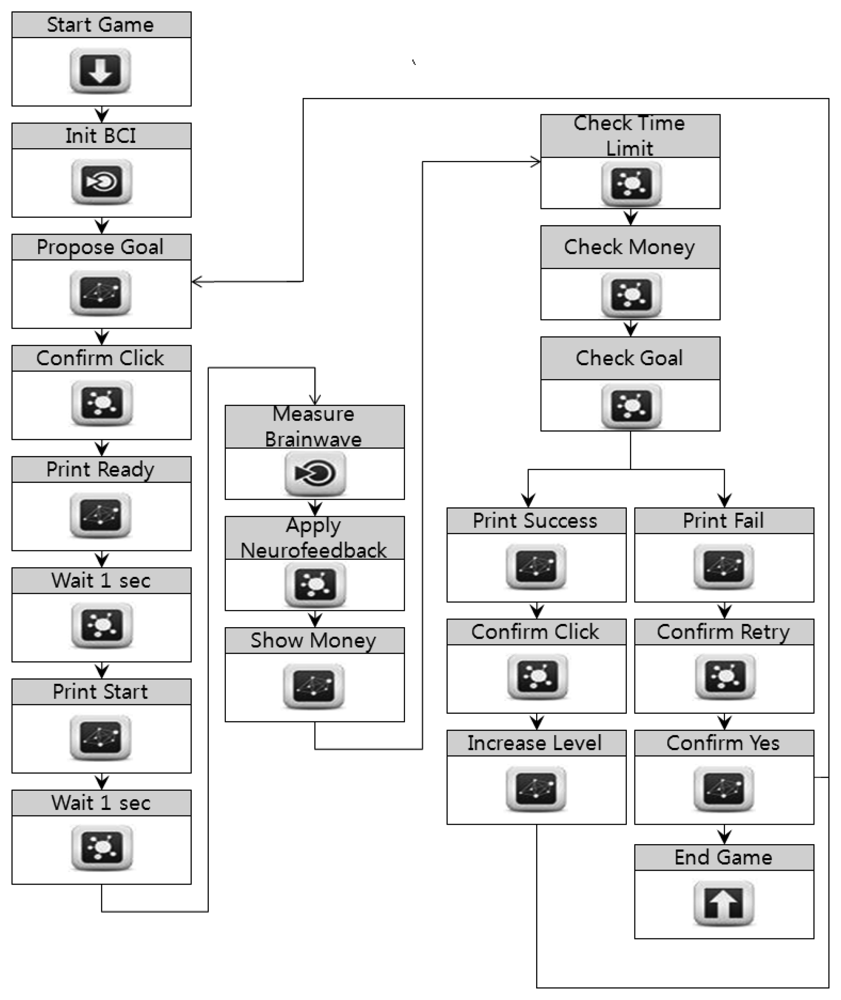 When the game starts, “Measure BCI” measures the user's brainwaves and applies neurofeedback. If the SMR wave does not maintain a value of over 90, the game is discontinued. In “Show Money,” the money begins to fall and the user collects various amounts by moving a basket with fingers on touchscreen or mouse or keyboard, to receive the money. Finally, the game state is evaluated and controlled. The target amount is checked after certain time intervals, as well as when a stage is successfully completed. When a stage is completed, a message of congratulations is displayed and the user acknowledges this success. The game level then goes up and a target amount is again presented. In case of failure, the game asks if the user wishes to play the game again. The user then confirms the failure and selects whether to continue the game. If the user stops the game, the application is closed. If the user continues the game, the level is not changed and a different target amount is again presented.