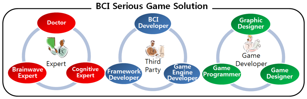 BCI serious games are produced by various developers. When BCI serious games are first developed, there are many difficulties with the roles of developers and processes of BCI serious game development. So, methodical development processes are required. For these, the type of developers should be defined, and their roles should be assigned. Figure 2 shows various developers and the relationship among them.