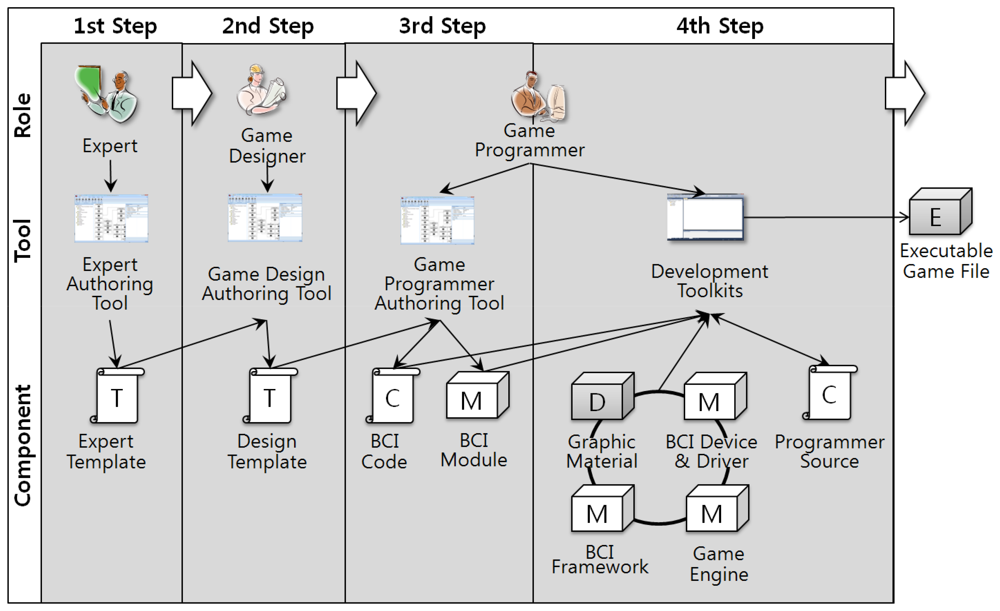 Experts define expert templates through a series of meetings. The expert templates describe the development approach in a way that can be easily understood without assuming that game developers have technical knowledge. All experts participate in defining this template, and determine when a BCI device should be initialized, utilized, and terminated. The types of brainwaves, frequency, and process order required for playing a game are defined by a symbol-based flow chart. The game design template defines how to play a game using measured brainwaves. The game designers define the game play, using flow charts to describe the game's processes.