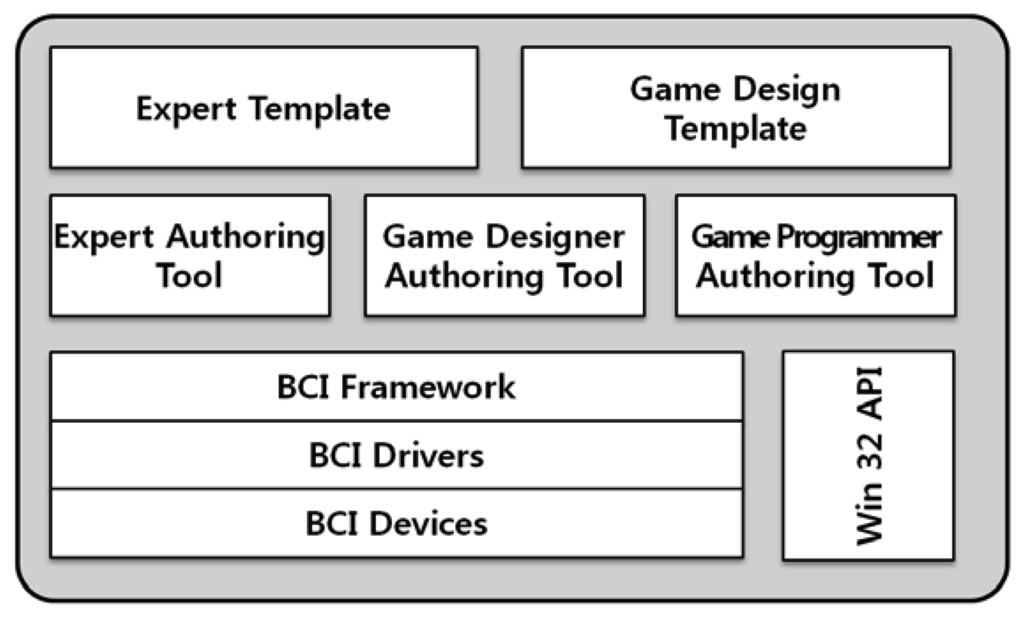 Some researches into the use of the measured brainwaves in BCI serious games have transformed the brainwaves, thus generating signals with a uniform distribution for each user [6,7]. Other researches have controlled diverse BCI devices using a unified interface, which transforms the brainwaves into signals suitable for BCI serious games [8]. However, in order to intuitively develop BCI serious games whilst reducing the time and cost required, we need a method that handles expert knowledge, diverse authoring tools for repetitive processes, and a BCI serious game development methodology.