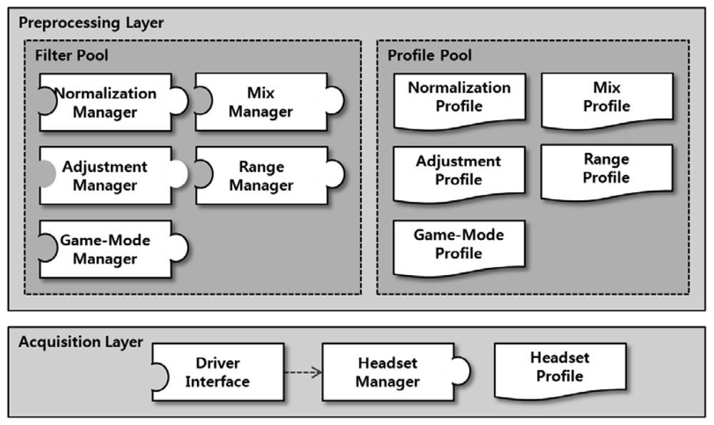 The Acquisition Layer integrates BCI drivers from diverse third parties, and so provides the unified interface. The Preprocessing Layer converts the measured brainwaves so that they can be easily applied in games or applications. For example, the measured brainwaves are fed into the Normalization Manager, which outputs a distribution suitable for game control signals. The Mix Manager generates new wave patterns by combining more than one brainwave, and the Adjustment and Range Managers adjust and process the input brainwave patterns. Finally, the Game-Mode Manager increases or decreases the intensity of brainwaves depending on the difficulty level of the game. Through the functions described above, the Preprocessing Layer can reduce the cost and time required for BCI game development. Each profile specifies the option for the corresponding Manager. For example, the Adjustment Profile contains information on how much the brainwave has increased or decreased.