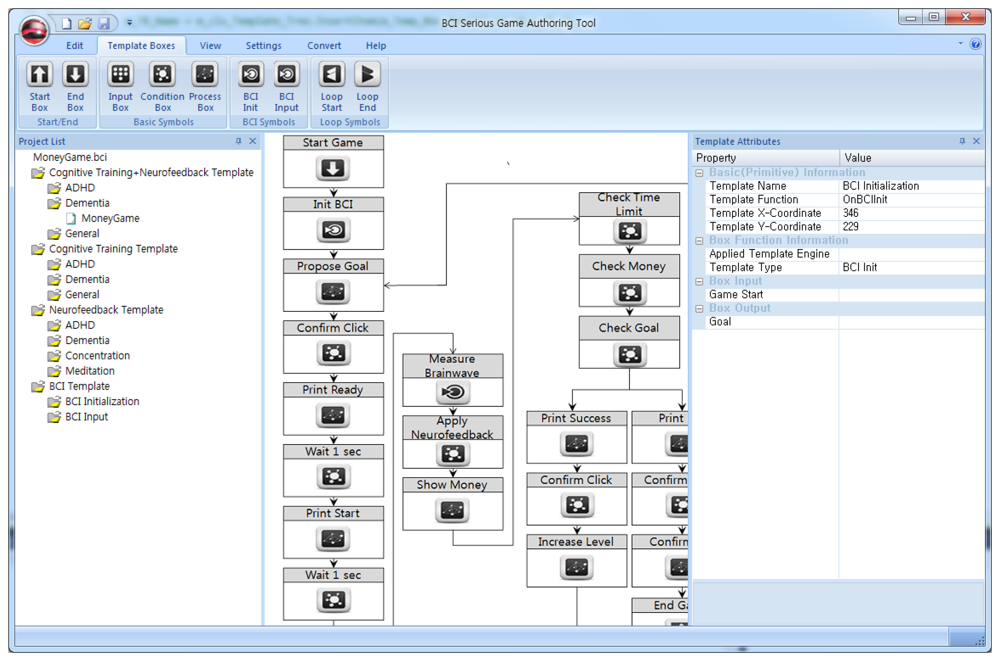 Figure 6 shows the authoring tool used by experts, game designers, and game programmers. It provides a tree view to select and use templates, which are listed by category. The categories are BCI templates, neurofeedback templates, cognitive training templates, and cognitive neurofeedback templates. The template tree is only used by experts and game designers. The authoring tool also includes an interface for drawing flow charts, and a list of the properties denoted by symbols in the charts. In each template, the flow chart is described using the functions provided by authoring tools. In addition, only the expert authoring tool has the authority to create new templates. The game programmers authoring tool is only utilized for generating game codes.