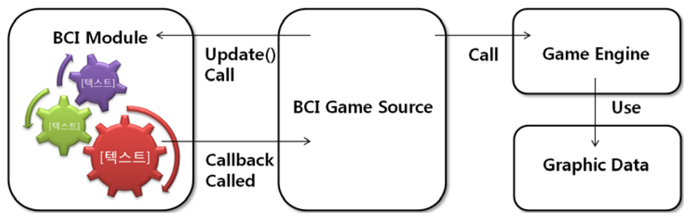 Research into BCI engines and toolkits for BCI serious games is still in its infancy. In this section, we review some research that can be applied to BCI serious game development. Most BCI application methods have been developed for research purposes. For example, Open-ViBE provides the functionality for processing measured brainwaves, and measures electroencephalography (EEG) and magnetoencephalography (MEG) [9]. Open-ViBE removes noise and intensifies signals during the preprocessing step. This involves extracting and classifying feature vectors, and translating them into commands. BCI2000 consists of a Source Module, Signal Processing Module, User Application Module, and Operator Module [10]. The Source Module provides data measurement and storage functions, and the Signal Processing Module extracts and translates features. The User Application Module is developed by the user. The Operator Module provides reference system parameters for each module. Unlike other frameworks, BCI2000 does not have a preprocessing step. BioSig is a software library for biomedical signal-processing tools [11]. It provides diverse functions for handling brainwaves based on various platforms. In particular, it provides functions for extracting and classifying features from brainwaves. Moreover, BioSig also incorporates visualization functions. The BCI++ framework has been proposed for laboratory implementation and daily life applications [12]. It is composed of a Hardware Interface Module (HIM) and AEnima. HIM includes functions for collecting and recording measured brainwaves, and AEnima provides the user interface, including graphics and audio engines. AEnima is installed on the subject's PC and HIM on the operator's PC. The operator analyzes changes in brainwaves corresponding to the subject's AEnima activity. BCI++ is open source (based on C++). BCI++ contains two modules, each of which provides an independent interface. Thus, it is not suitable for games that are implemented as one independent application.