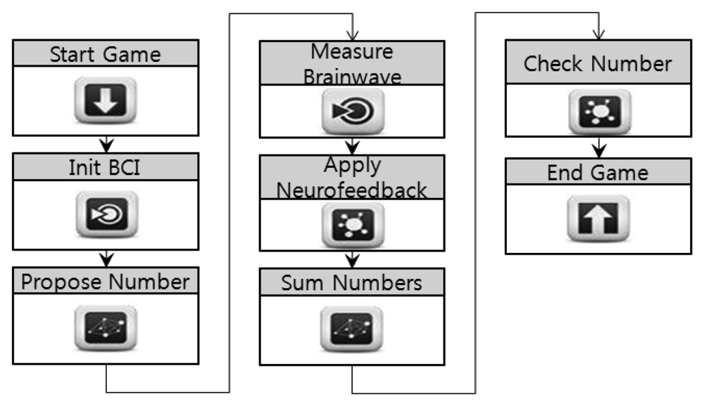 The experts design a number counting game for the patients. A Sensory Motor Rhythm (SMR) wave is applied, which is converted into values from 0 to 100 by the BCI framework. This setting is described at the “Init BCI” symbol by experts. The goal of the game is to make a number by adding or subtracting values. Users must increase their brainwaves to 90 during the “Apply Neurofeedback” step as shown in Figure 8. When the converted value reaches 90, the patient can start to calculate numbers. The calculated numbers are checked and then the game ends. These rules are described in each symbol's property. By playing this game repeatedly, mathematical ability can be improved through summing numbers, and brain functions can also be improved through neurofeedback.