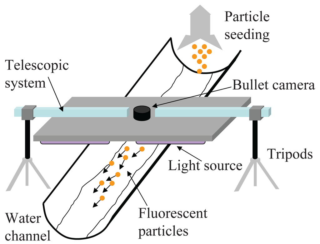 Experiments are executed by deploying batches of approximately 3 g of fluorescent particles in the water channel. Surface flow velocity in the channel is first experimentally measured by deploying corks and other similar lightweight objects on the water surface and then evaluating the time they take to flow through the channel with a chronometer. The sensing apparatus is placed across the channel with the light unit and camera parallel to the water surface, see Figure 1.