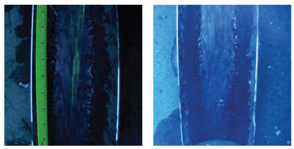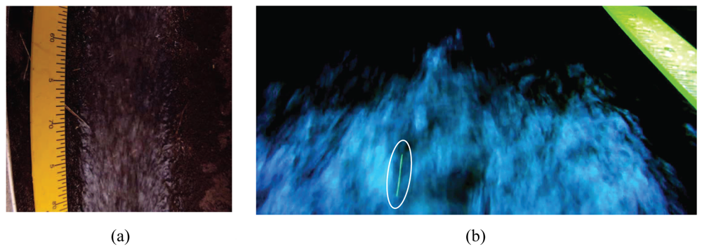 Differently from [,], a miniature water proof Bullet HD 1080p camera is placed in the center of the plate where a circular 2.5 cm aperture is created, see Figure 1. This camera offers performance comparable with much bulkier and more costly devices. Further, such configuration allows for minimizing distortions from the inclination of the camera with respect to the region of interest in the captured videos. For instance, Figure 2(a) depicts the water channel monitored by the sensing station where the camera is placed in the center of the plate. A metric ruler indicates that the image is not severely distorted. On the other hand, Figure 2(b) is recorded with the camera placed offset by the center of the light unit. As emphasized by the metric ruler and the elongated shape of the green-fluorescent particle in the foreground of the picture, the image would require a preliminary orthorectification phase to eliminate distortions and allow for quantitative analysis.