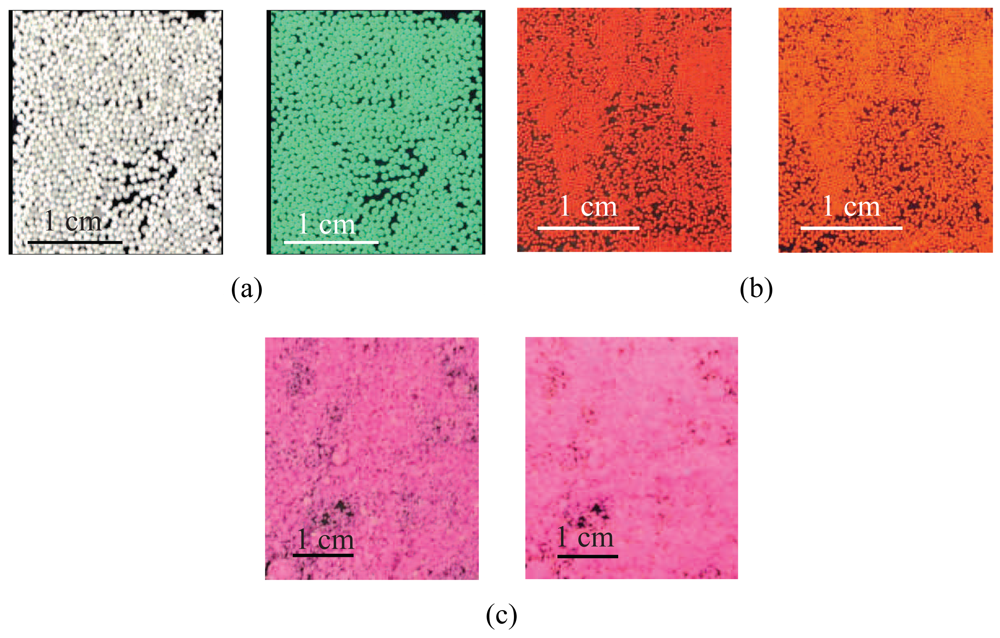 Red-fluorescent beads are also purchased from Cospheric LLC, Figure 3(b). Their cost is 9.9 $/g. Such particles are available in smaller sizes, that is, 250–300 μm and their nominal dry density is 0.995 g/cm3. They are spherical in shape and present a high emission peak at 605 nm if excited by white light, that is, by a light source emitting from 460 to 650 nm. Such broad excitation range allows for adopting inexpensive and versatile white LEDs as light source in the sensing apparatus. The beads' polyethylene matrix is infused with the fluorophore, thus guaranteeing color-stability.