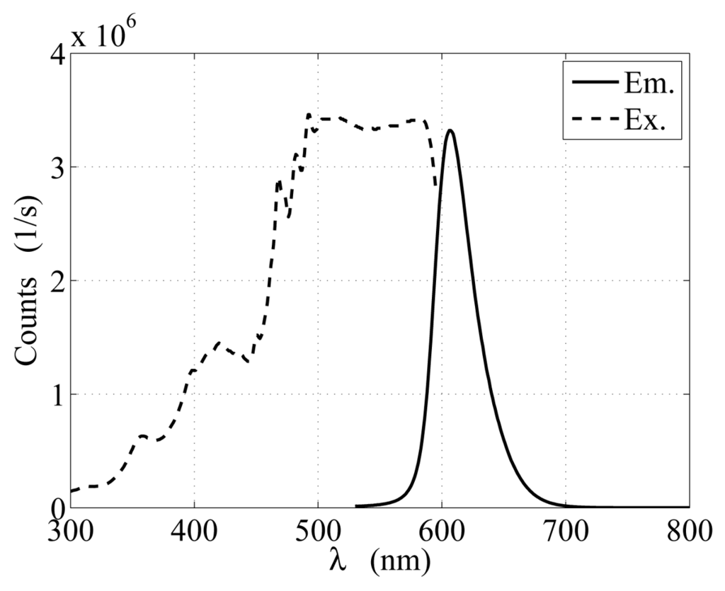 Another class of orange-fluorescent particles is considered for experiments with the sensing apparatus, Figure 3(c). Differently from the other tracers, such particles are in-house fabricated from nontoxic Fluorescent FWT Red Dye Concentrate, Cole Parmer®, and natural white beeswax pellets purchased from Stakich Inc., MI []. The beads are environmentally friendly and their excitation and emission spectra are displayed in Figure 4 as obtained by analyzing a 2 mL sample of melted particles with PTI Quanta Master 40 spectrofluorometer. The particles are produced by melting the beeswax at 60°–65° C and then mixing it with a 6 × 10−3μg/L diluted solution of the fluorophore. The homogeneous emulsion of beeswax and fluorophore is then instantaneously cooled down by adding water at 5 ° C. This phase leads to the formation of wax drops of variable diameters that rapidly solidify and migrate to the water surface of the suspension. Beads of 250–420 μm in diameter are obtained through filtering and sieving the material. The particles are neutrally buoyant and spherical in shape and their cost is only 0.025 $/g.