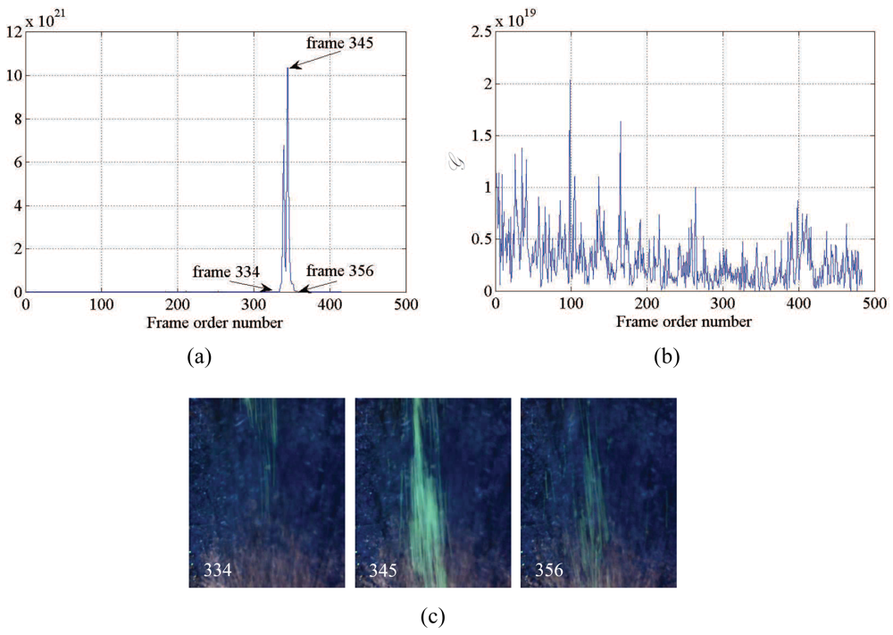 Findings from experiments conducted with the green-fluorescent beads are reported in Table 1, where letter “Y” indicates successful experiments and letter “N” denotes failed tests. Specifically, experiments are considered successful if the time series of the index presents a clearly identifiable peak and such peak depicts the transit of the particles in the field of view from visual inspection. For reference, Figure 5(a) shows a successful experiment conducted in the morning, at H = 15 cm, v = 2 m/s, WVGA resolution, and without filter; whereas Figure 5(b) displays a failed experiment under more severe conditions, that is, recorded during the morning, at H = 40 cm, v = 2 m/s, WVGA resolution, and without filter. Specifically, intensity values in Figure 5(b) are generally lower than intensities in Figure 5(a) and observed peaks do not correspond to the transit of the particles in the region of interest. As reported in Figure 5(c), frames 334, 345, and 356 correspond to the entrance, the transit, and the exit of the cloud of fluorescent particles underneath the camera, respectively. As expected, frame 345 depicts the maximum presence of beads in the captured field of view.