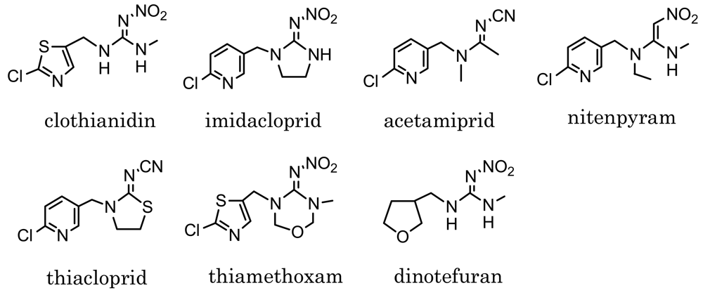 Neonicotinoids such as those shown in Figure 1 are relatively new insecticides structurally related each other, and are originated from imidacloprid, which has been put on the market since 1992 [1–3]. Neonicotinoid insecticides are similar to nicotinoids in binding to the nicotinic acetylcholine receptor of insects [4,5]. Because of the high sensitivity of insects and low toxicity to mammals, they have been used worldwide as substitutes of conventional insecticides, e.g., organophosphates, carbamates and pyrethroids [6]. Clothianidin, (E)-1-(2-chloro-1,3-thiazol-5-ylmethyl)-3-methyl-2-nitroguanidine, which is one of the neonicotinoid insecticides, is effective against various insects, such as hemiptera, diptera, lepidoptera, coleoptera, thysanoptera and orthoptera species. Easily absorbed and transported into plants, it has been applied for paddy rice and various garden crops after registration in Japan in 2002 [7]. Dinotefuran, 2-methyl-1-nitro-3-(tetrahydrofuran-3-ylmethyl)guanidine, which was registered in 2004 as a neonicotinoid insecticide, is also effective against various insects like clothianidin [8]. At present, dinotefuran is one of the most widely used insecticides for garden crops in Japan.