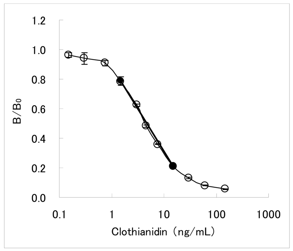 The dc-ELISA is a simpler assay than the ic-ELISA described above, requiring less assay steps. It has been therefore adopted for developing commercially available test kits for agrochemicals immunoassay [26–31]. The dc-ELISA targeted clothianidin residue analysis in garden crops has been also constituted. Concentrations of the MoAb CTN-16A3-13 and the hapten-HRP conjugate were 2.0 μg/mL and 0.014 μg/mL, respectively. Under this condition, the inhibition curve with working range of 1.5–15 ng/mL was obtained as shown in Figure 2. Here, the working range is defined as the concentration range from IC20 value to IC80 value. The IC50 value is 4.4 ng/mL. The inhibition curve in the working range seemed to be almost linear, and a linear line calculated from IC20 and IC80 values (y = −0.58 log10X + 0.89) was considered to be applicable as a 2-point standard curve. In our experience, dc-ELISAs for pesticide residue analyses typically needed 51-fold dilution of the samples [19]. For most garden crops of which MRLs is from 0.2 to 15 mg/kg for clothianidin, the sensitivity of the developed dc-ELISA was considered to be sufficient for analyzing the residual clothianidin with such dilution process.
