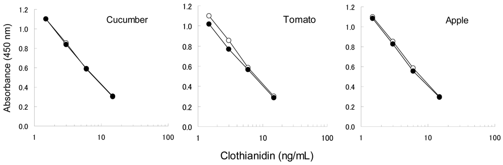 To confirm the applicability of the dc-ELISA based on the MoAb CTN-16A3-13, the influence of matrix substances from garden crops should be examined. The matrix substances are considered to mainly affect the binding ability of the MoAb with the hapten-HRP conjugate, rather than the insecticides themselves which have low molecular weights. In addition, clothianidin and dinotefuran have similar chemical properties each other. Clothianidin was therefore selected as the representative to be examined here. Four concentrations of clothianidin (1.5, 3.0, 6.0 and 15 ng/mL) spiked in garden crop extracts were compared to the relevant controls (10% methanol with clothianidin) as shown in Figure 3, in order to confirm the influence of matrix from cucumber, tomato and apple. Each clothianidin concentrations were equivalent to 0.077, 0.15, 0.31 and 0.77 mg/kg in the garden crops, which was selected based on the target MRLs, 0.2–15 mg/kg. The results from the extracts were agreed well with the control results for cucumber and apple, while a slight interference was recognized in the case of tomato. Although the interference on tomato resulted in 20%–30% higher than expected, it is acceptable level to apply the dc-ELISA. The dc-ELISA also showed applicable results for dinotefuran as well as clothianidin (data not shown).