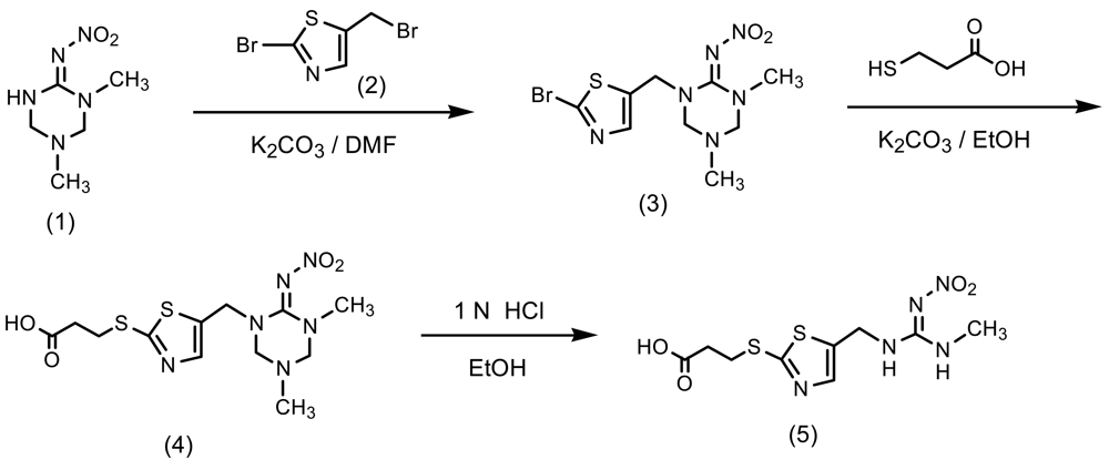 A mixture of 1,5-dimethyl-2-nitroiminohexahydro-1,3,5-triazine (1) (3.4 g, 20 mmol), potassium carbonate (3.0 g, 22 mmol) and 2-bromo-5-bromomethylthiazole (2) (5.6 g, 22 mmol) in acetonitrile (65 mL) was refluxed for 3 h. The reaction mixture was concentrated under reduced pressure. To the residue was added methanol (30 mL) and filtered. The filtrate was concentrated to give 1-(2-bromothiazol-5-ylmethyl)-2-nitroimino-3,5-dimethylhexahydro-1,3,5-triazine (3) as a brown oil (1.8 g, 26% yield). 1H-NMR (CD3OD) δ; 2.06 (3H, s, CH3), 2.84 (3H, s, CH3), 4.34 (2H, s, CH2), 4.39 (2H, s, CH2), 4.70 (2H, s, CH2), 7.65 (1H, s, CH): To a solution of the triazine (3) (1.2 g, 3.4 mmol) in ethanol (10 mL) was added 3-mercaptopropionic acid (0.43 g, 4 mmol) and potassium carbonate (1.1 g, 8 mmol). The mixture was stirred for 10 h under reflux, and concentrated under reduced pressure. The residue was acidified at pH 3 by adding water (10 mL) and 1N hydrochloric acid, and the product was extracted with ethyl acetate (30 mL). The organic layer was washed with water, dried over anhydrous magnesium sulfate, filtered and concentrated to give 3-[5-(3,5-dimethyl-6-nitroimino- hexahydro-1,3,5-triazin-1-ylmethyl)thiazol-2-ylthio]propionic acid (4) as a brown oil (0.7 g, 68% yield). The propionic acid (4) (0.45 g, 1.1 mmol) and 1N hydrochloric acid (6 mL) in ethanol (10 mL) was stirred at 40 °C for 5 h and concentrated under reduced pressure. The residue was purified by flash column chromatography on silica gel eluted with ethyl acetate/methanol (9.5/0.5, v/v) to give 3-[5-(3-methyl-2-nitroguanidinomethyl)-1,3-thiazol-2-ylthio]propionic acid (hapten) (5) as a yellow oil (0.19 g, 55% yield). 1H-NMR (CD3OD) δ; 2.76 (2H, t, J = 5.0 Hz, CH2), 2.90 (3H, s, CH3), 3.39 (2H, t, J = 7.5 Hz, CH2), 4.61 (2H, s, CH2), 7.58 (1H, s, CH).