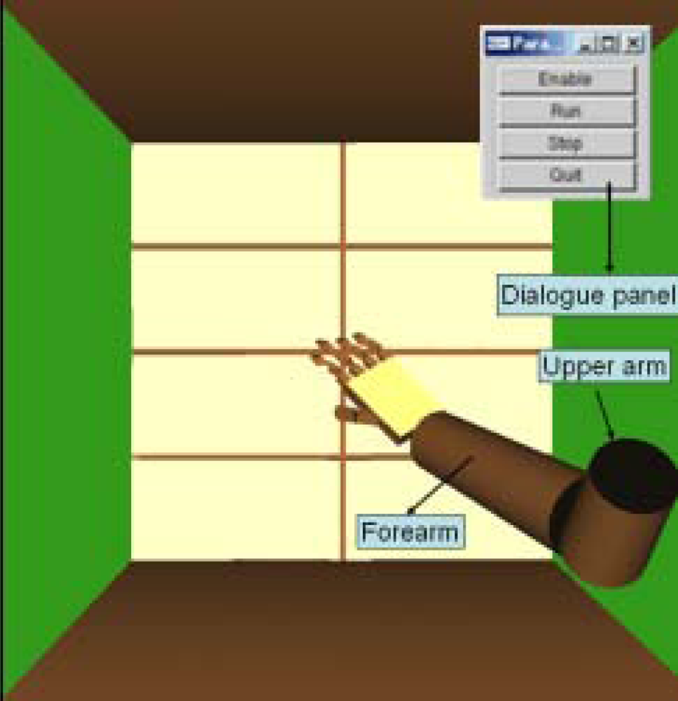 A visual user interface based on OpenGL is created, in which two linkages stand for upper arm and forearm. There are also some manipulation buttons on the monitor, including “enable”, “run”, “stop” and “quit”, which are convenient for the user to control the situation of the task (Figure 10).